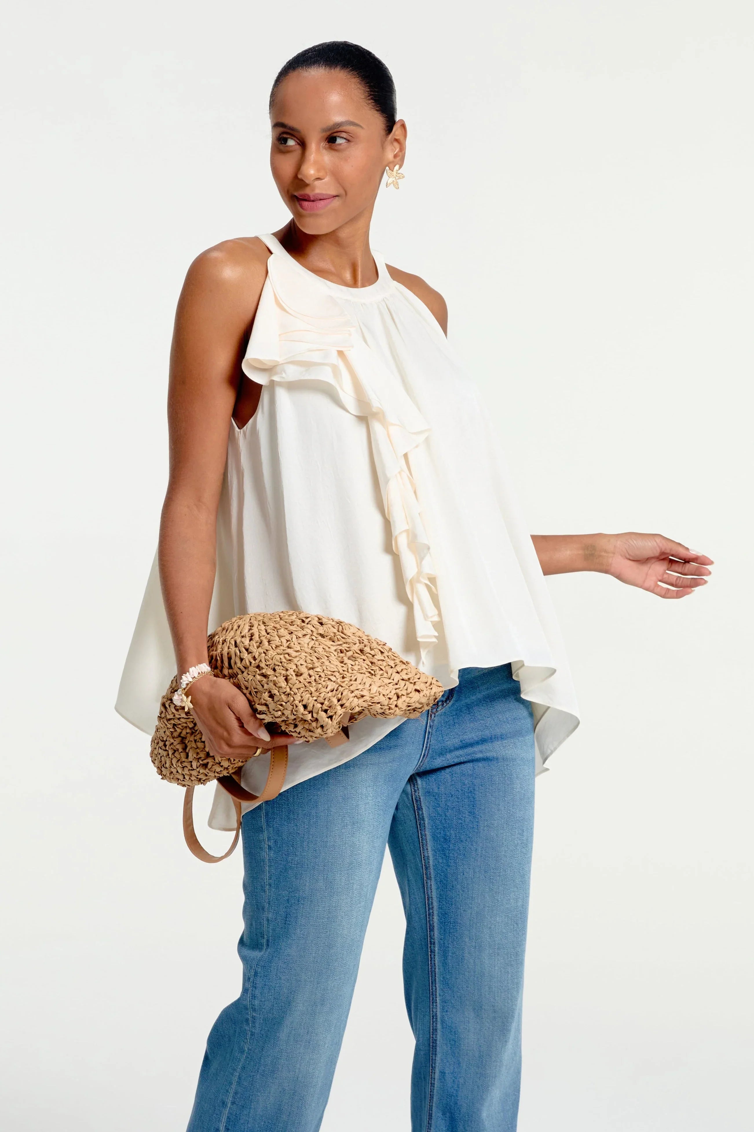Romantic drama with a modern twist—our Asymmetrical Ruffle Halter Top in Oatmeal  brings movement and elegance to every step. With a soft drape, flowy hem, and statement ruffle cascading from the neckline, this sleeveless silhouette flatters from every angle. Crafted in a silky, lightweight fabric, it’s designed to flow freely and style effortlessly, from date nights to dressy daytime plans.