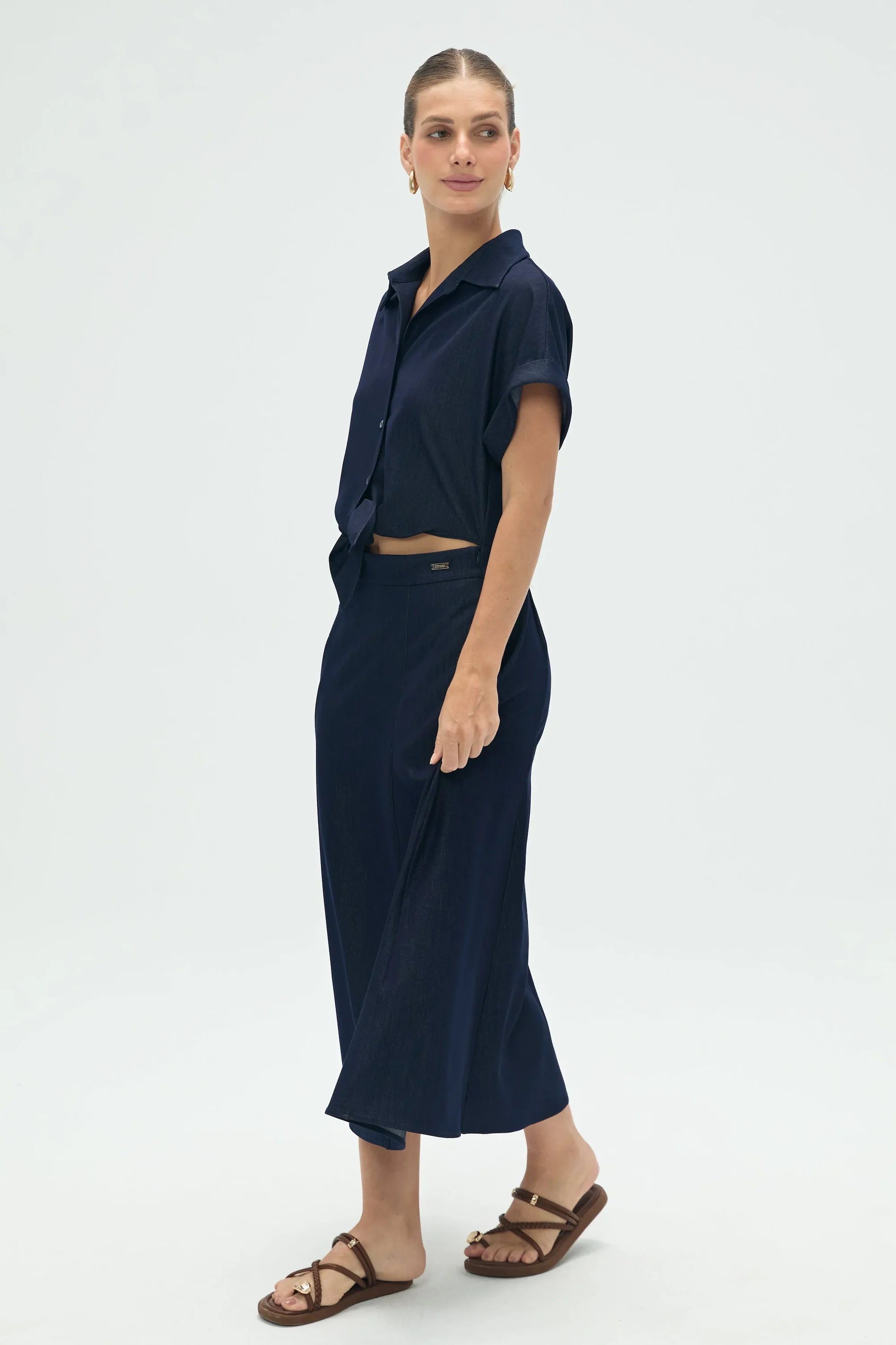 Effortlessly cool and vacation-ready—our Coastal Set in Deep Navy is your all-in-one outfit for easy elegance. The breezy short-sleeve button-up features a relaxed fit with dropped shoulders and side slits, perfect for wearing tied or loose. Paired with a fluid, high-waisted midi skirt that drapes beautifully with every step, this set is as polished as it is comfortable. Wear them together for a head-to-toe statement or mix and match with your wardrobe staples.