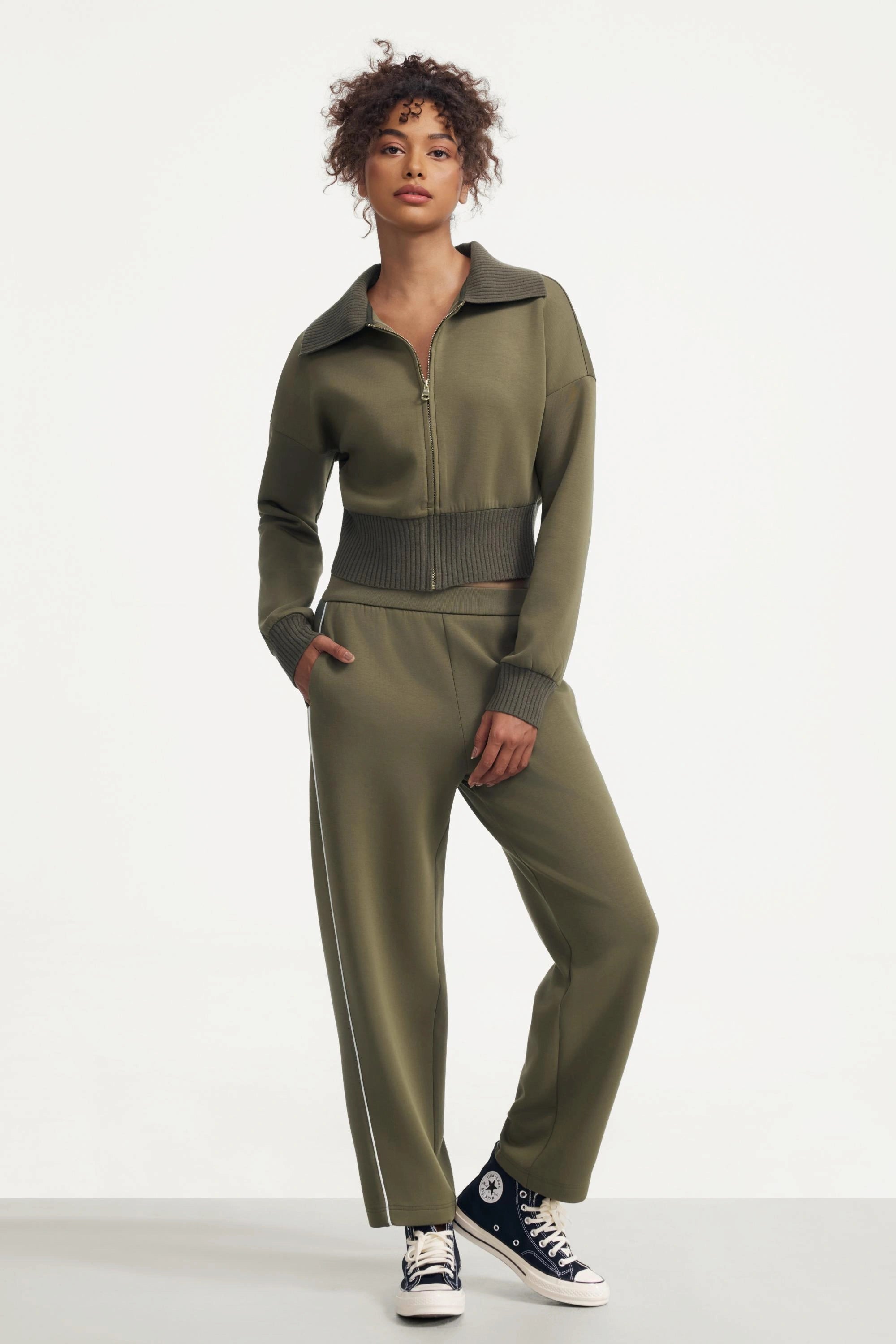 A refined layer with a sporty edge. The Zip-Front Knit Jacket features a soft structured knit with a flattering cropped length and ribbed waist that defines the silhouette without feeling restrictive. Designed with a clean collar and full zip closure, this piece blends comfort and polish—ideal for everyday wear, travel, and effortless layering.