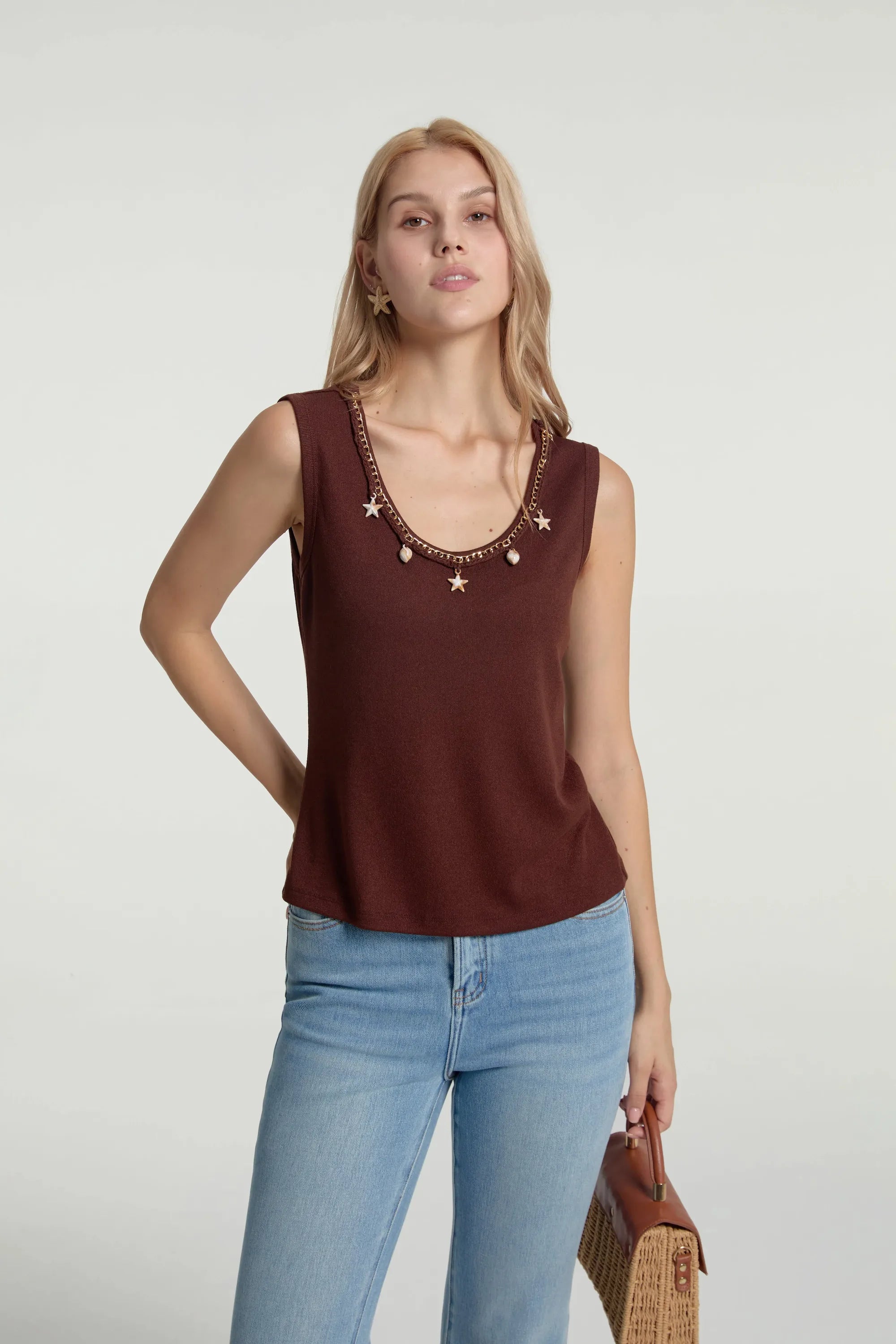 Bring a little whimsy to your wardrobe with our Charm-Embellished Knit Tank, available in two beachy-chic shades: Cocoa Shell and Coastal Blue. This sleeveless scoop-neck tank blends comfort with playful detail, thanks to its soft stretch knit and hand-placed metallic charms and beads that sparkle like seaside treasures. Fitted but not tight, it’s the kind of top that turns heads while staying effortlessly wearable.